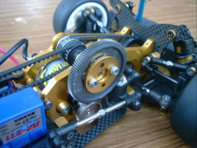 | フロントサスの部分です。 フロントサスブロックはリヤのサスブロックを移植してワイドトレッド化になっています。フロントワンウェイは純正品を追加加工して6ミリのワンウェイベアリングに交換、更にカップをワイドトレッドに対応するようにワイド仕様を製作してあります。 |